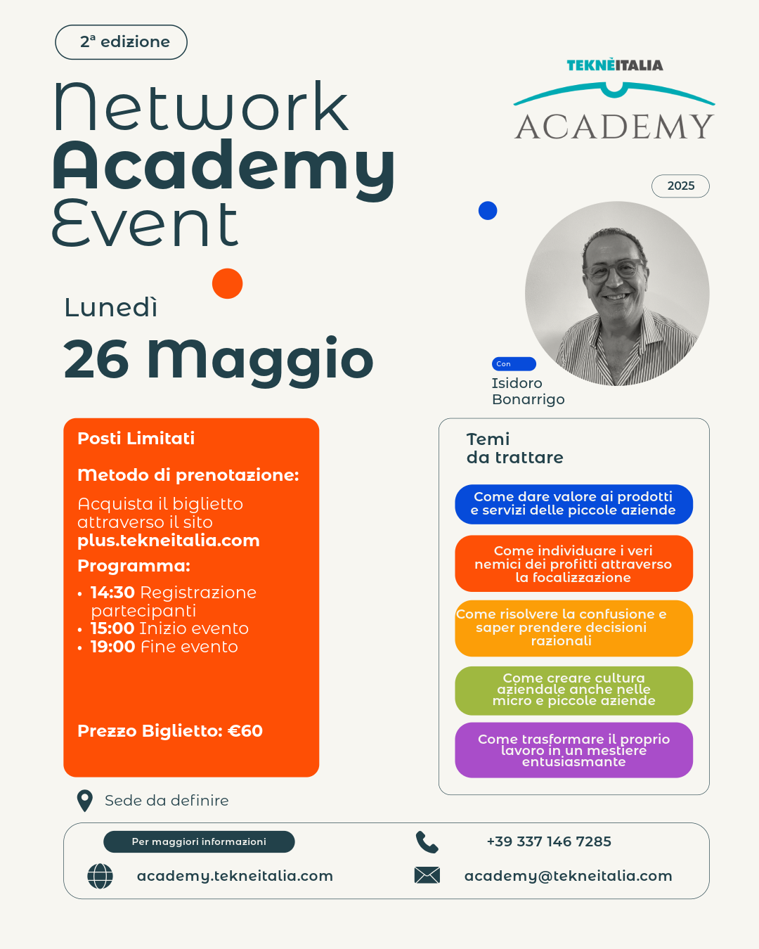 Partecipa all’incontro Network Academy Event Lunedi 26 Maggio 2025 (seconda edizione) organizzato da TeknèItalia Academy.
